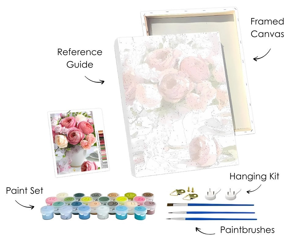 - Unbox Your Kit: Open your package and take out your numbered canvas, acrylic paint pots, and paintbrushes.