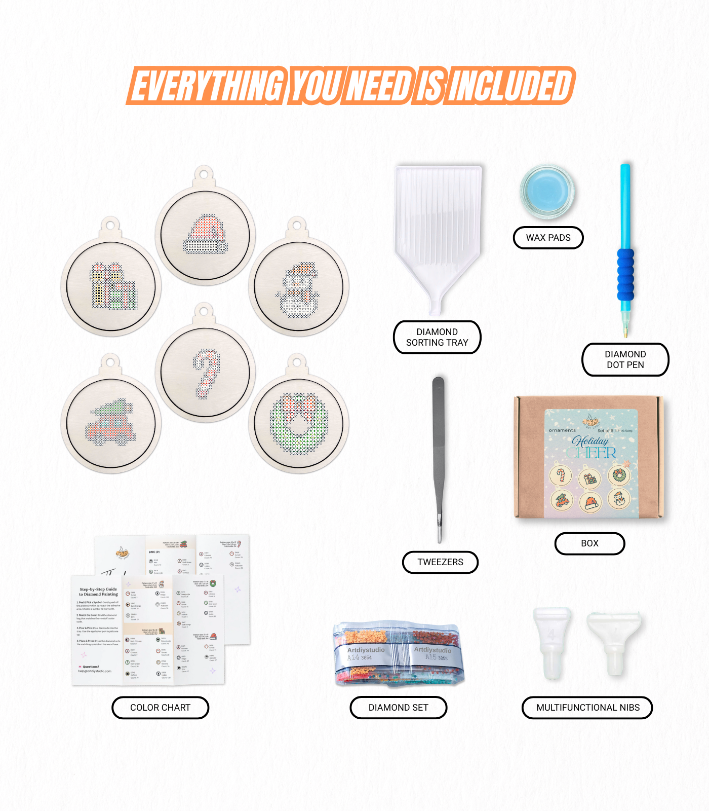 Add festive sparkle to your Christmas décor with this adorable set of 6 mini diamond painting ornaments. Each 3.7" (9.5 cm) wooden ornament features a cute holiday design and uses round diamonds.